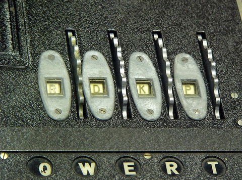 下の画像の状態で暗号文の一文字目を打つ場合、初期設定はRDKPである(ただし、エニグマのローター数は基本的に3つなので、初期設定も3つのアルファベットになるのが普通)